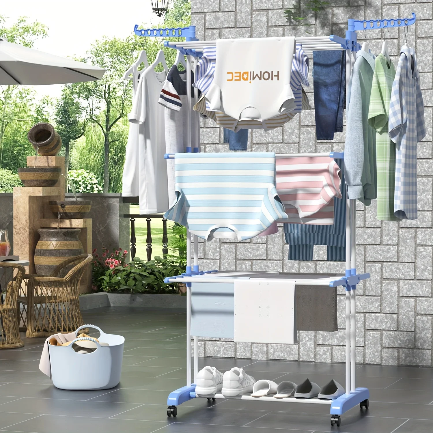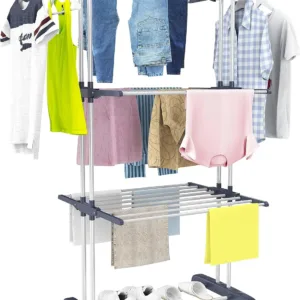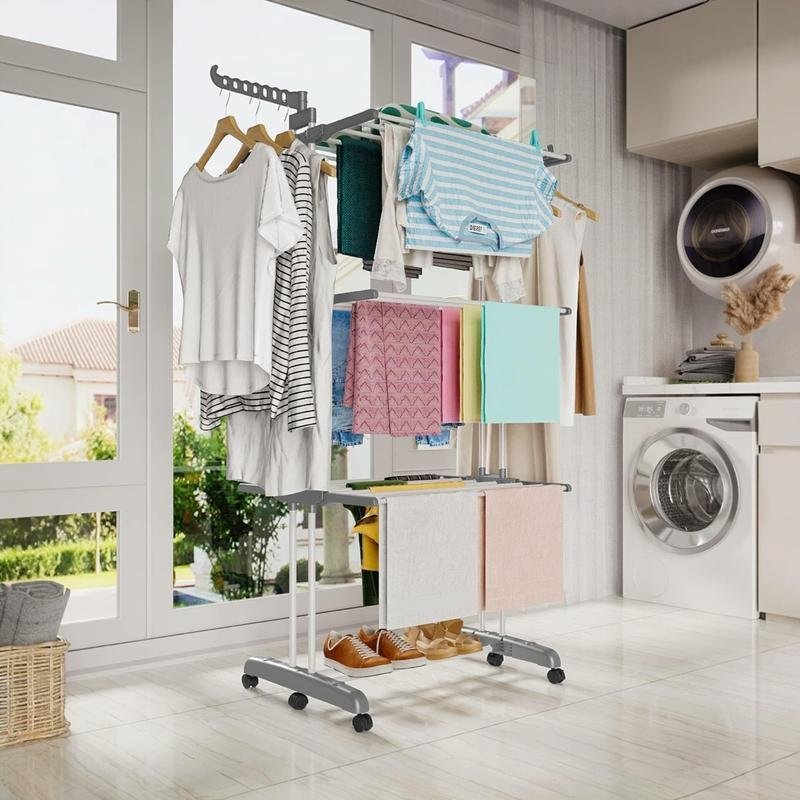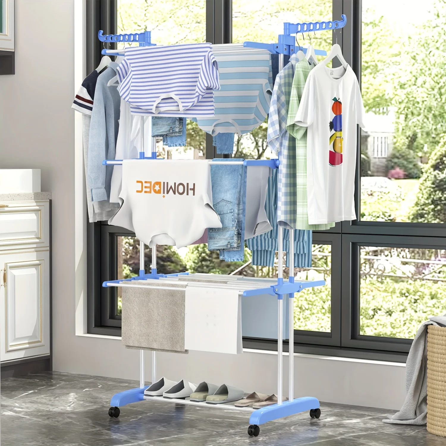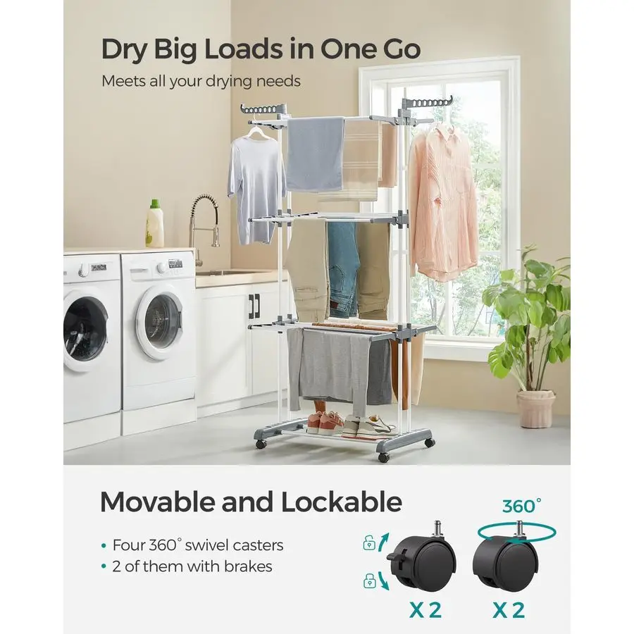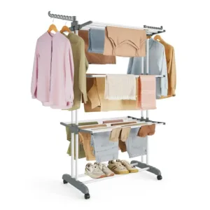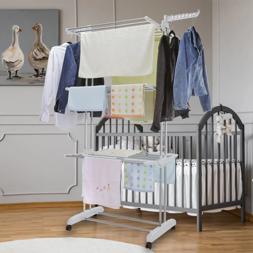Los 4 niveles de este tendedero con ruedas permiten tender todo tipo de ropa, desde camisetas hasta pantalones y toallas.